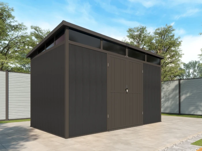 Een klassiek lessenaarsdak in een modern concept! Deze blokhut is gemaakt van composiet en heeft aan 3 zijden ramen. Het tuinhuis heeft een strakke uitstraling. De composiet platen zijn voorbewerkt door ingefreesde composietplaten. Het versterkte dak is gemaakt van gegalvaniseerd staal en voorzien van een afvoerset. De co-extrusieplaten zorgen voor een langere levensduur.